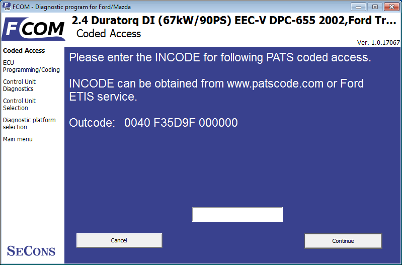 Rappelez-vous que pour chaque OUTCODE généré par une unité de contrôle, il est nécessaire d'obtenir un INCODE unique. Utiliser un seul et même INCODE lors de plusieurs opérations avec PATS n'est pas possible.