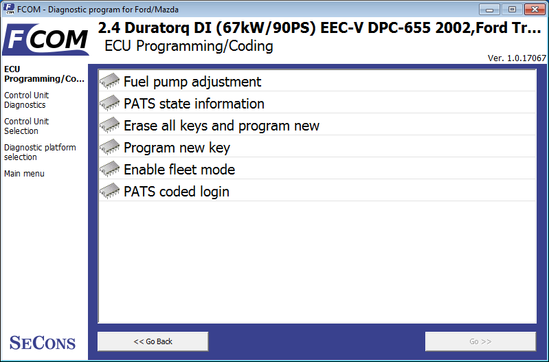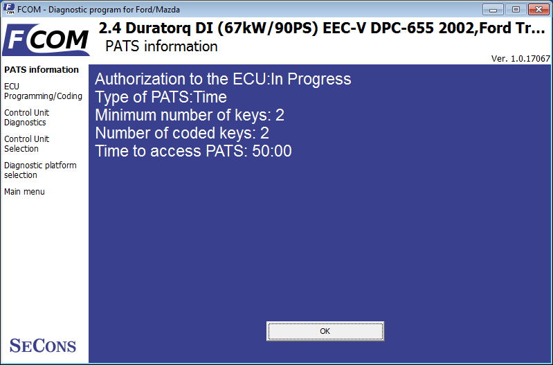 Pour les véhicules qui utilisent plusieurs ECU pour le système PATS (par exemple PCM et IPC, BCM RKE ou SCIL), les ECU doivent contenir les mêmes données de sécurité du véhicule. À cette fin, FCOM fournit la fonction « PATS Pairing », qui est disponible dans le menu de codage des ECU non PCM (IPC, BCM, SCIL ou RKE). La fonction est disponible uniquement sur les PATS codés.