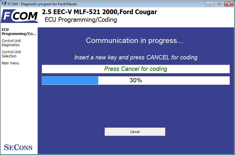 Vous pouvez annuler le compte à rebours en cours en cliquant sur le bouton Annuler. Pendant que le FCOM attend le déverrouillage de l'unité de commande, il communique avec l'unité de commande et le contact doit donc être mis sur ON.
