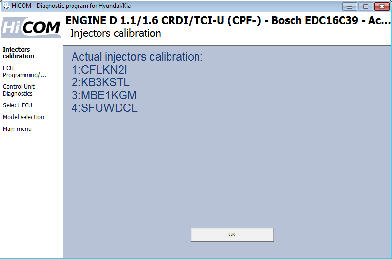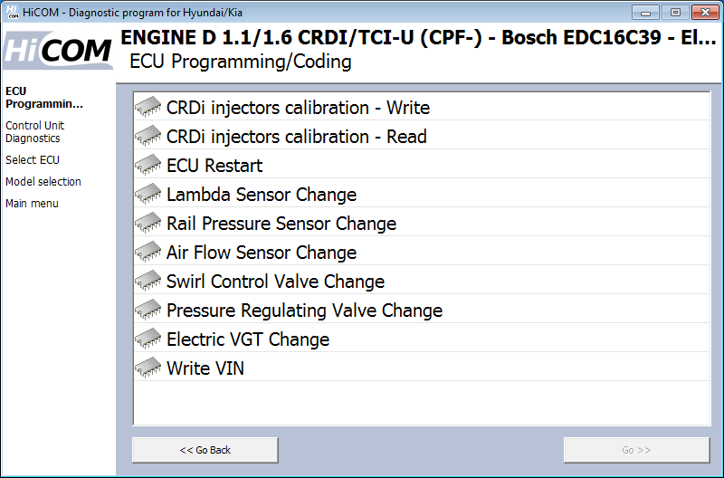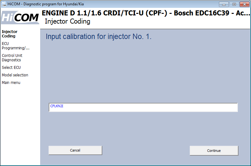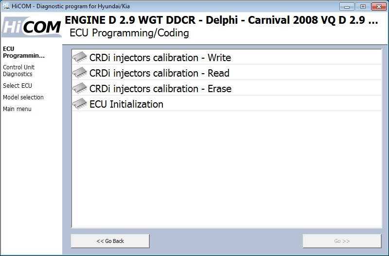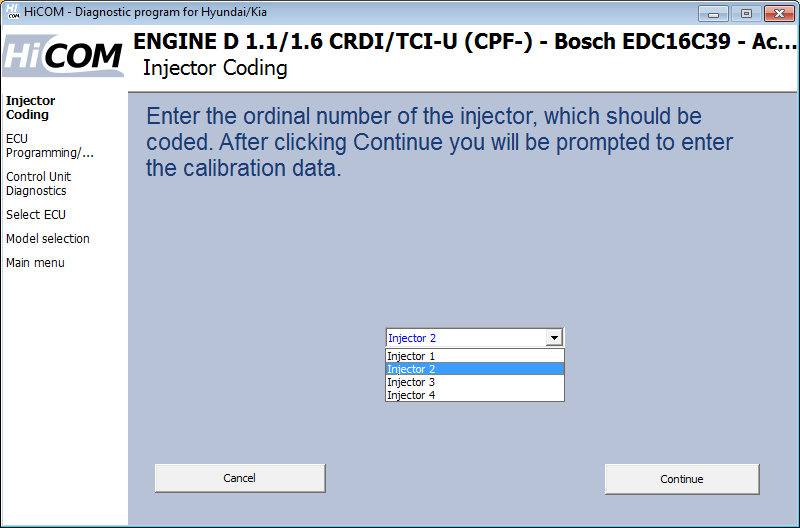 L'étalonnage de l'injecteur CRDi est disponible dans le menu « Programmation/codage de l'ECU » après la connexion à l'unité de commande du moteur diesel.