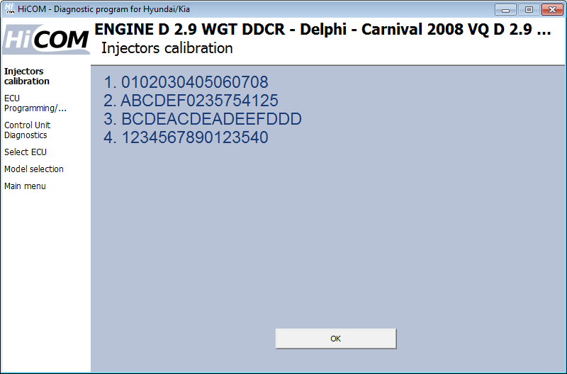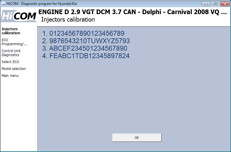 Exemple de numéros d'étalonnage saisis dans l'unité de contrôle Delphi DCM sur le bus CAN. Pour chaque injecteur est entré un numéro d'étalonnage à 20 chiffres, contenant des lettres et des chiffres.